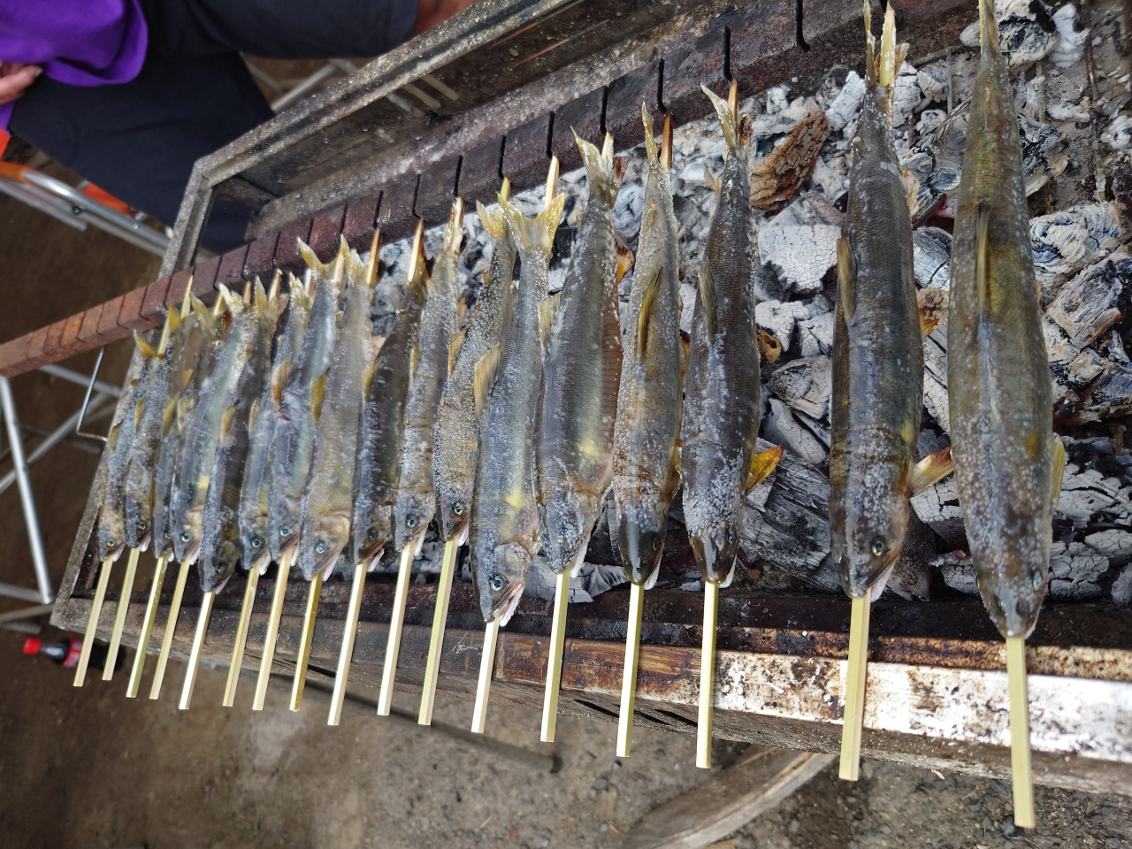 いとこお手製の焼台にきれいに鮎が並んでいます。